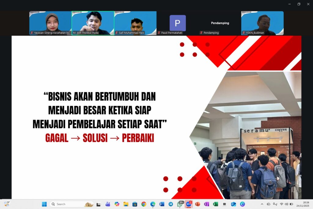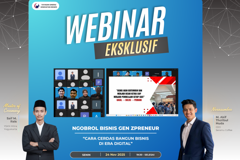 Yayasan Sinergi Kesehatan Negeri menyelenggarakan Webinar Eksklusif bertajuk “Ngobrol Bisnis Gen Zpreneur “Cara Cerdas Bangun Bisnis di Era Digital”. Kegiatan yang diadakan secara daring melalui platform Zoom ini menghadirkan narasumber berkompeten, M. Akif Tholib Huda (CEO Seramu Coffee), dengan pemandu acara Saif M. Rais dari YSKN Mitra Yogyakarta. Webinar ini dirancang untuk memberikan wawasan dan panduan praktis kepada generasi muda yang ingin mengembangkan usaha di lingkungan bisnis digital yang terus berkembang.